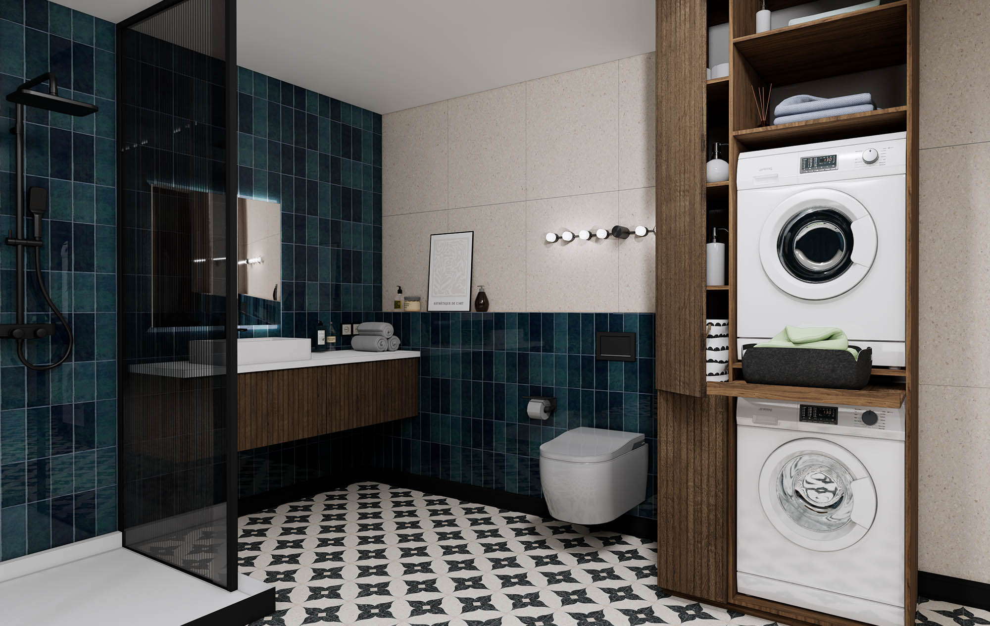 Эта постирочная — функциональное и стильное пространство с минималистичной мебелью, встроенными техникой и системами хранения. Её особенность — лаконичные линии, нейтральные тона и продуманная эргономика для удобства и порядка.